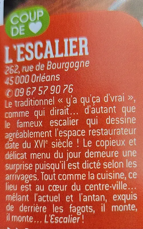 Situé au cœur du centre historique d’Orléans, L’Escalier vous accueille dans un cadre chaleureux et convivial.